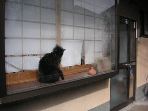 京都の町家の中には、出窓風のショーウィンドーとも呼ぶべき空間を持っているところが多い。 その中でも特に商売とは関係なさそうなものに注目してみる。 ガラスが曇っているせいか目を凝らしてみないと分からないが、 この飾り物は微妙に動いている。そう、…