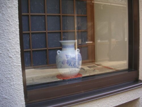 京都の町家には、出窓風のショーウィンドーとも呼ぶべき空間を持っているところが多い。 その中でも特に商売とは関係なさそうなものに注目してみる。ガラスが反射して上手く撮れなかった。 因みに今は途絶えてしまった手作りガラスである。
