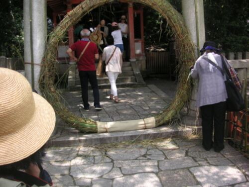八坂神社の疫神社では、7月31日に大茅の輪を設け、夏越祭が行われる。 いつもは静かな神社も、この通りお参りの人が列をなしている。この神事をもって、1か月にわたる祇園祭が終わる。普段の疫神社