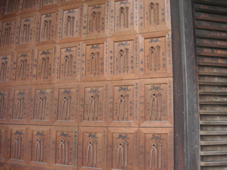 2015-11-09 石像寺・釘抜き地蔵 お寺 釘抜き地蔵さんの名前は聞いていたが、お参りしたのは初めてである。 小さなお寺にもかかわらず、参拝客が多いのにはびっくりした。前世の罪で手の病気に苦しむ人の夢枕に地蔵菩薩が現われ、 手に刺さっていた二本の恨みの釘を抜いて救ったことから、苦しみを抜くという信仰が生まれたと ものの本に書いてあった。苦しみを抜いてもらった人がお礼に奉納する絵馬が、本堂の外壁に所狭しと張られている。